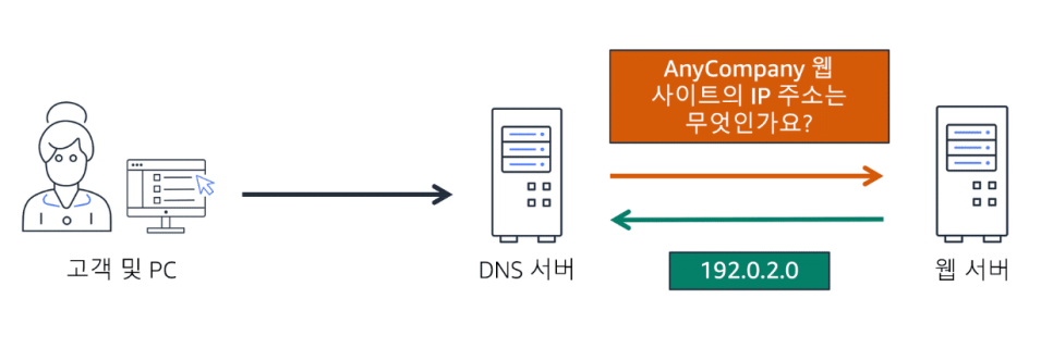 Amazon Route 53은 DNS 확인을 사용하여 A사의 IP 주소인 192.0.2.0을 식별. 이 정보를 다시 고객에게 전송